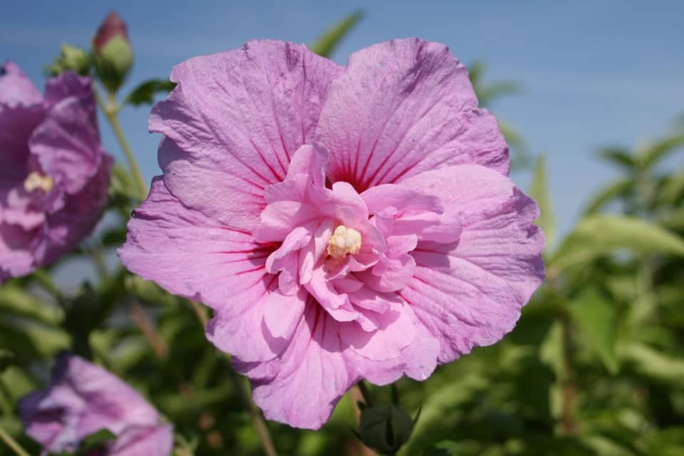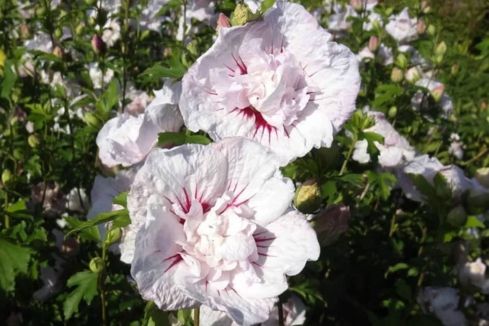 Гібіскус «Шифоновий букет» дуже гарно квітне. Огортає ділянку напрочуд ніжними квітами. Цвітіння триває з липня до заморозків.