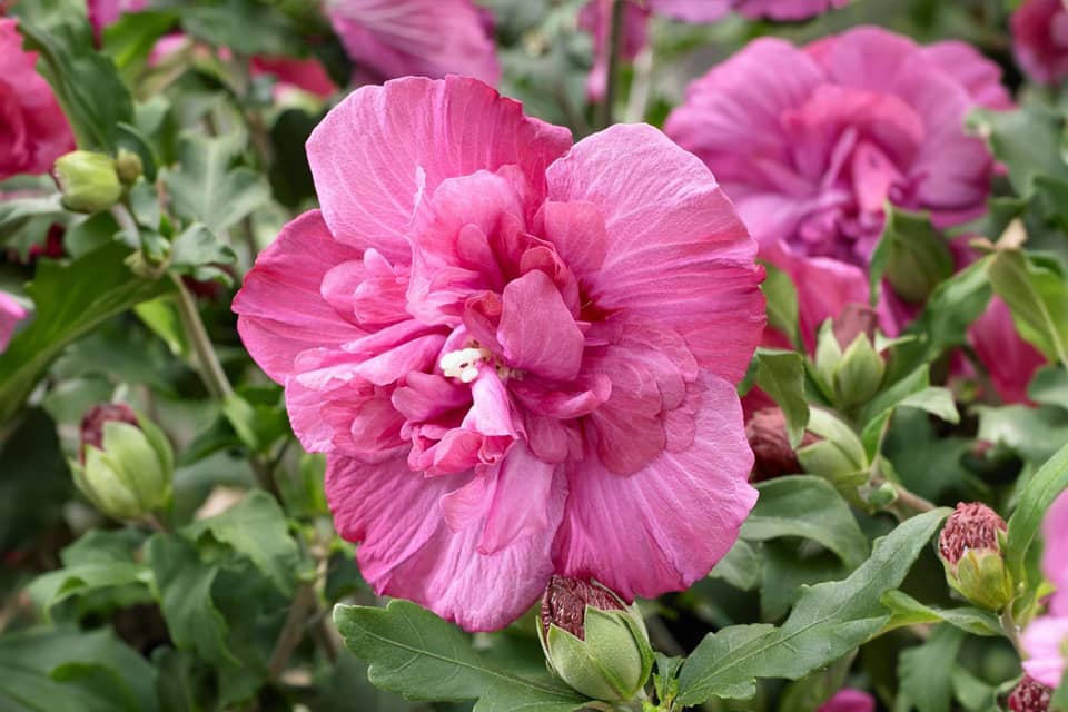 Гібіскус «Шифоновий букет» прикрашає місцевість великими, ніжними, різнокольоровими квітами.
