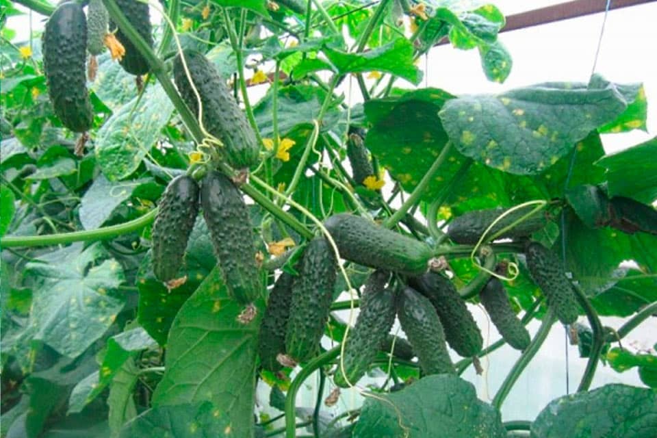 Гибрид «Эколь F1» характеризуется компактным кустом, обильно укрываемым плодами корнишонного типа. Огурцы весом 90-100 г, длиной 6-9 см. В одном узле формируется 4-5 плодов.