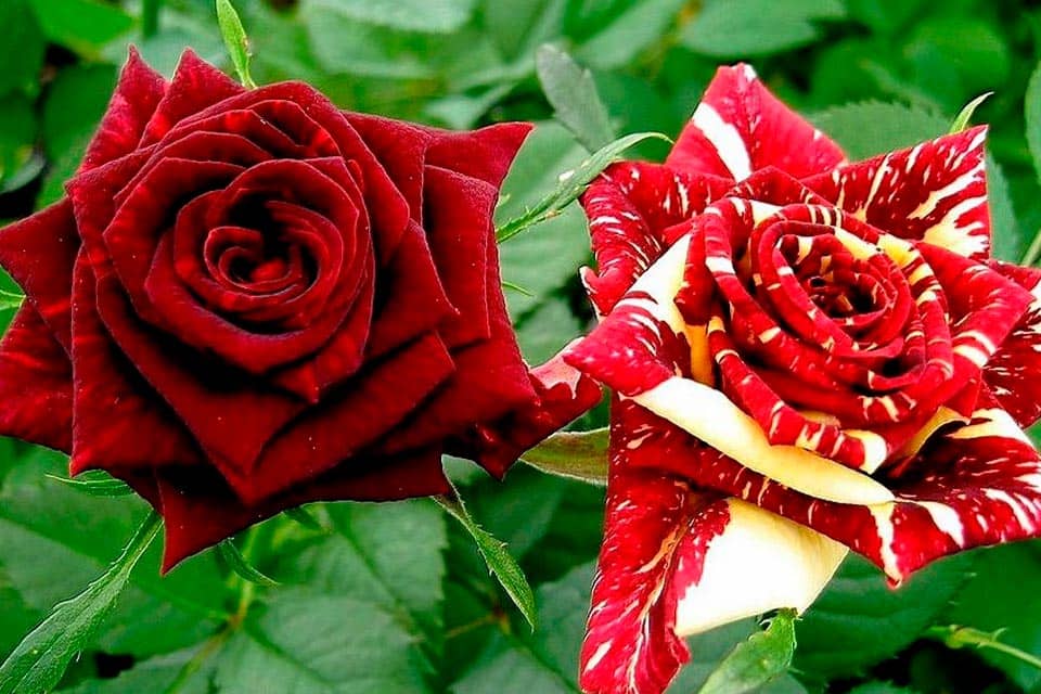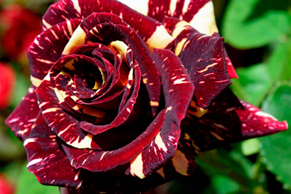 Чайно-гібридна троянда «Абракадабра» рясніє оригінальним забарвленням, в якому поєднуються кілька кольорів.