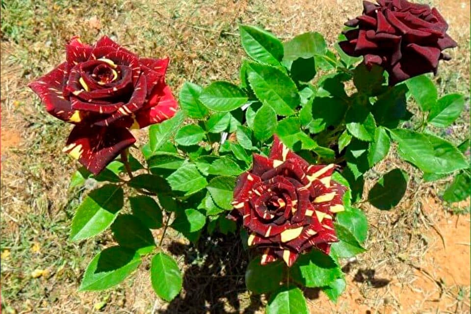 Рослина може набувати форми прямостоящого або розлогого куща. Його висота – 70-150 см. Темно-зелене листя осипає стебла з невеликою кількістю колючок. Квітки діаметром до 12 см розкриваються поодинці або в суцвіттях. Пелюстки рясніють різнокольоровими смугами (бордовими, жовтими та білими), які комбінуються в різні візерунки.