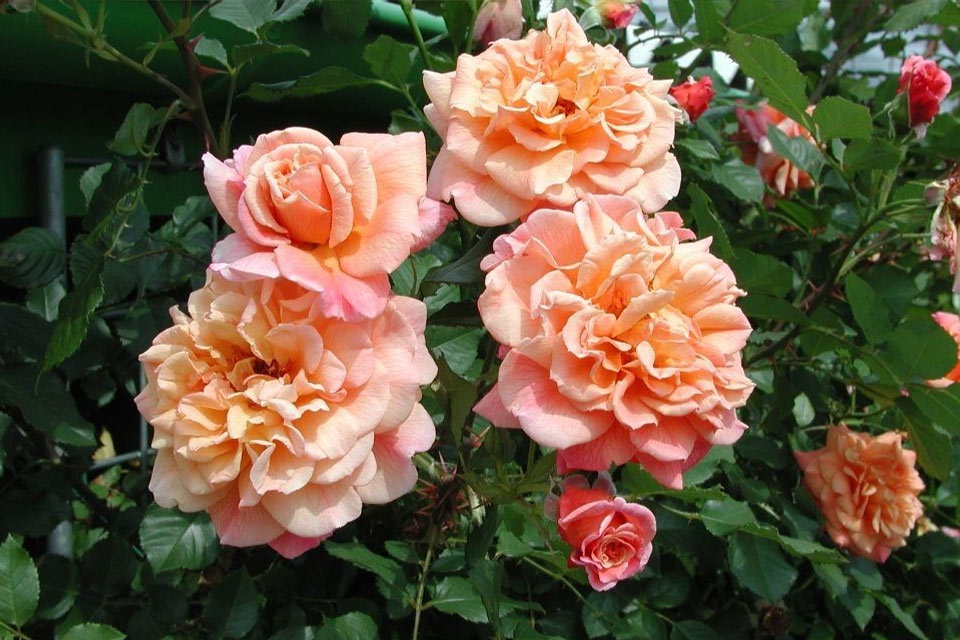 Бутон троянди «Алоха» повільно розкривається, демонструючи перетікання забарвлень – бордові пелюстки поступово набувають теплий малиново-жовтогарячий відтінок, а з зовнішнього боку вони переливаються від насиченого до ніжного тону рожевого кольору. У результаті, квітки діаметром близько 10 см неймовірного абрикосово-рожевого відтінку з низу до верху рясно всипають кущ, який досягає завдовжки близько 2,5 м і розростається завширшки до одного метра.