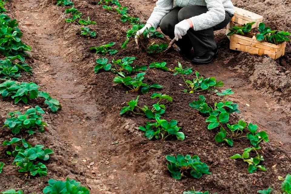 При копанні посадкових ям рекомендується врахувати габарити кущів полуниці. Між кущами потрібно залишити 30 см вільного простору, між грядками – близько 40 см. Перед висаджуванням коріння рослини треба занурити в розчин біостимулятора та обірвати листя. Далі чекає посадка саджанців у ґрунт.