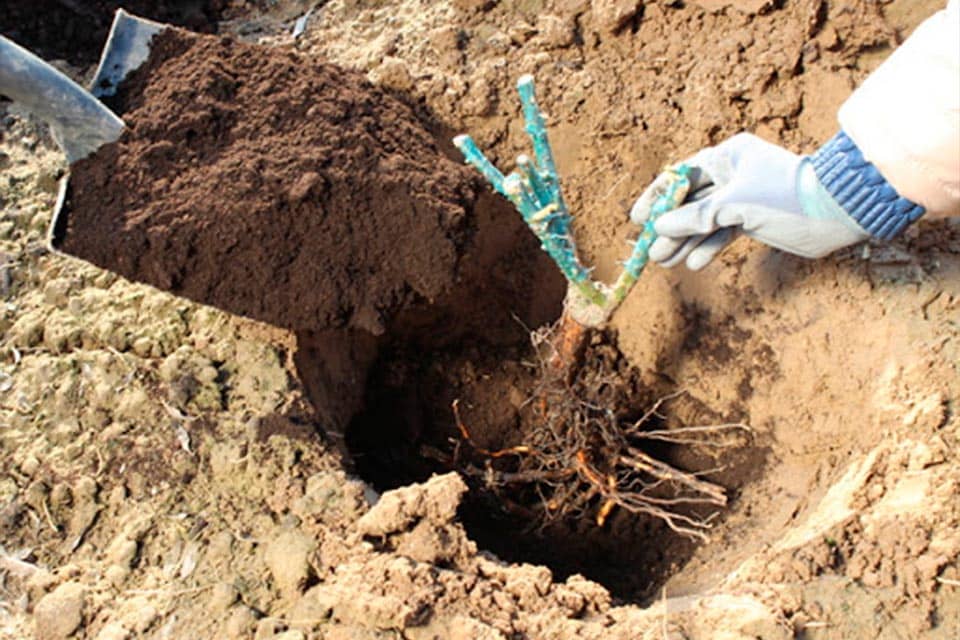 Яму потрібно викопати розміром 50х50 см та залити в неї 15 л води. Перед посадкою молоду рослину необхідно витримати у холодній воді близько півгодини. Після проведених процедур для покращення якості землі можна приступати до посадки. Пустоти в лунці треба обережно засипати ґрунтом і утрамбувати. Після висаджування навколо куща слід сформувати невеликий валик, який не дасть воді розтікатися при поливі.
